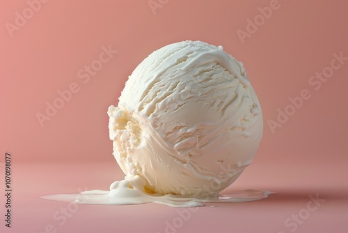 Scoop of vanilla ice cream is slowly melting on a pink background