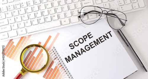 SCOPE MANAGEMENT text written on a notebook with keyboard, chart,and glasses