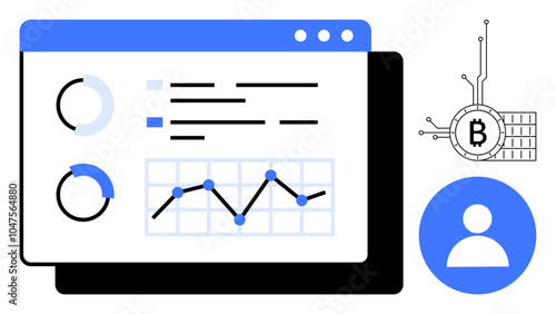 Screen displaying circular and line graphs with profile icon and cryptocurrency symbol. Ideal for analytics, data visualization, cryptocurrency analysis, user interface design, digital tech. Flat