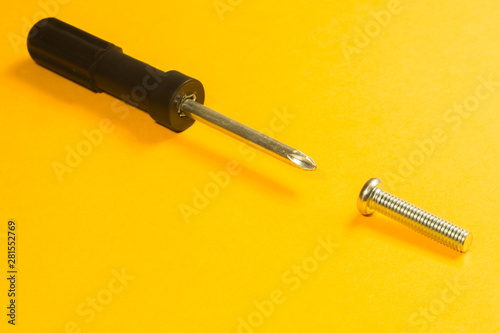 Screws and screwdriver on a yellow background