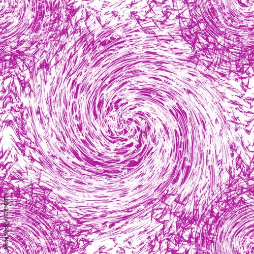Seamless abstract pattern with wavy and spiral lilac lines and spots on a white background. Surface with distortion effect.