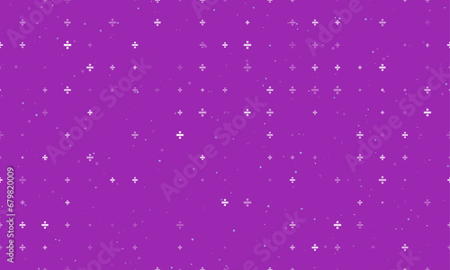 Seamless background pattern of evenly spaced white division symbols of different sizes and opacity. Vector illustration on purple background with stars