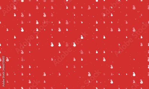 Seamless background pattern of evenly spaced white pear symbols of different sizes and opacity. Vector illustration on red background with stars