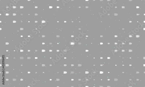 Seamless background pattern of evenly spaced white video camera symbols of different sizes and opacity. Vector illustration on grey background with stars