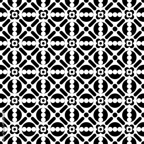 Seamless black and white geometric pattern, featuring a symmetrical design with floral motifs. Suitable for backgrounds, wallpapers, textiles, fabrics and various creative projects.