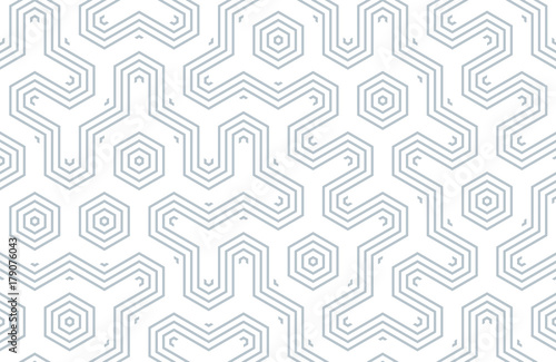 Seamless geometric pattern with hexagons and lines. Irregular structure for fabric print. Monochrome abstract background.