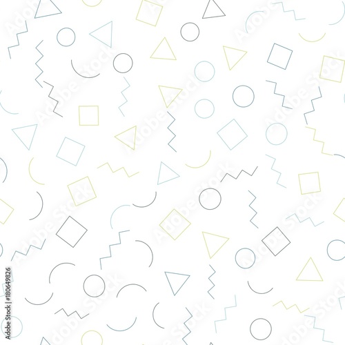Seamless memphis geometric pattern with white background. Trendy memphis style. Vector repeating texture.