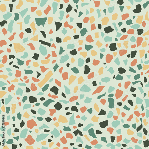Seamless multicolored terrazzo pattern on a light green background