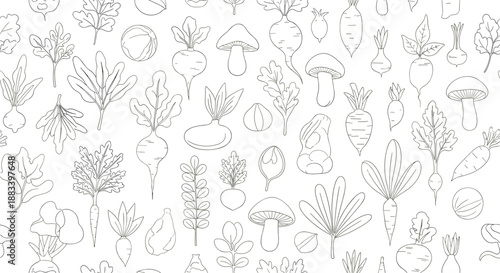 Seamless pattern of hand drawn vegetable outlines in black and white featuring various greens, roots, and mushrooms on a clean white background.