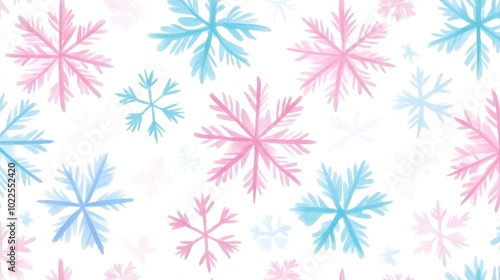 Seamless pattern of hand-drawn, pastel-colored snowflakes on a white background
