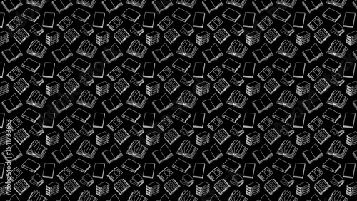 Seamless pattern of white outline books on a black background, open and closed, stacked and single books