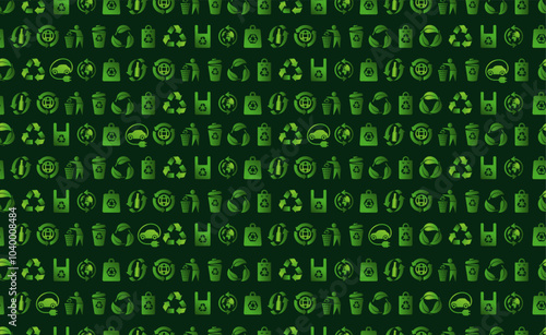 Seamless pattern trash garbage related. Background on a black green Include of lamp, bag and glass bottle. Vector illustration of eco Icons. Trash garbage green related logo seamless pattern.