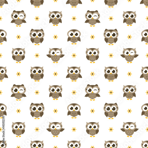 seamless pattern with brown owls and flowers