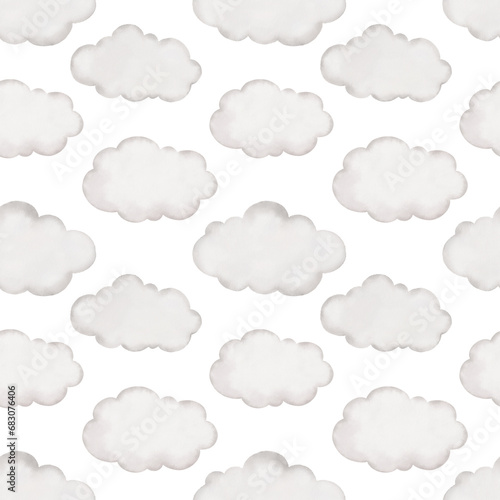 Seamless pattern with cute white clouds. Watercolor hand drawn illustration with white isolated background. Baby shower clipart.