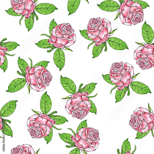 Seamless pattern with pink fresh roses and green leaves on white background. Hand drawn watercolor and ink illustration.