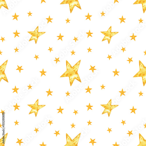 Seamless pattern with yellow stars, watercolor illustration. Stars on a white background. Cosmic, astronomical pattern, magical ornament. Good for fabric, textile, pajama, linen, wallpaper, background