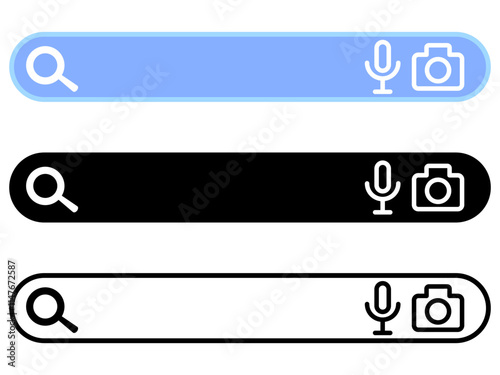Search Bar Magnifying Glass, microphone and camera Icon, simple flat style, illustration, logo sign symbol pictogram template, for ui or ux isolated on white for mobile app, editable