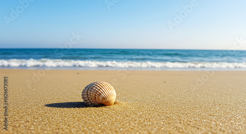 Seashell Harmony Serene Beachscape with Ocean Waves Under Clear Blue Skies