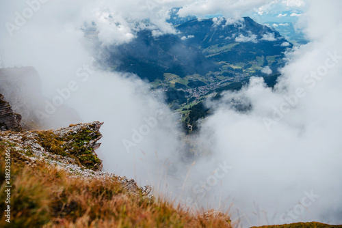 Seceda mountain ridge with clouds and a village nestled in the valley below