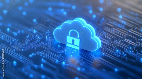 Secure cloud computing concept with glowing blue cloud and lock icon on a circuit board, representing data security and online protection.