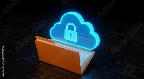 Secure Cloud Data: An illuminated cloud icon, symbolizing data security and protection, hovers over an open folder, representing digital data storage.
