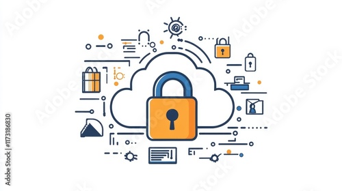 Secure cloud icon with a closed padlock, surrounded by digital elements representing cybersecurity and encrypted storage