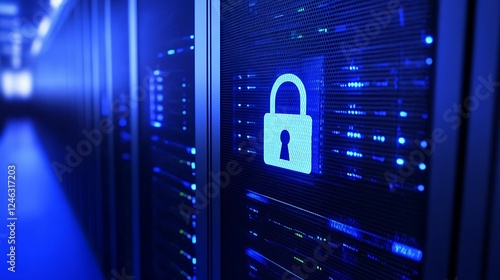 Secure Data Center with Lock Symbol Representing High-Level Cybersecurity Measures and Data Protection Safeguards