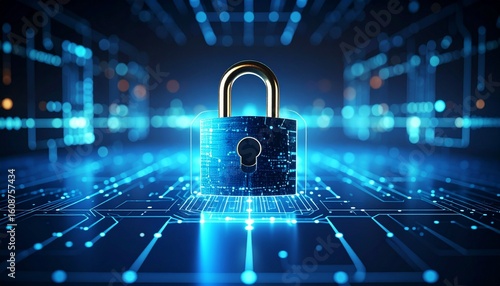 Secure digital lock on a futuristic technology background glowing blue