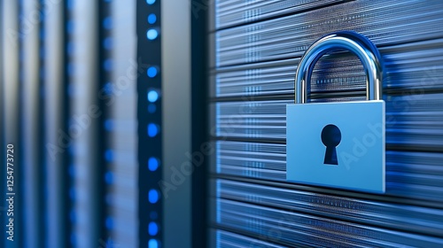 Secure Lock on Server Rack Representing Data Protection and Cybersecurity Measures in a Digital Environment