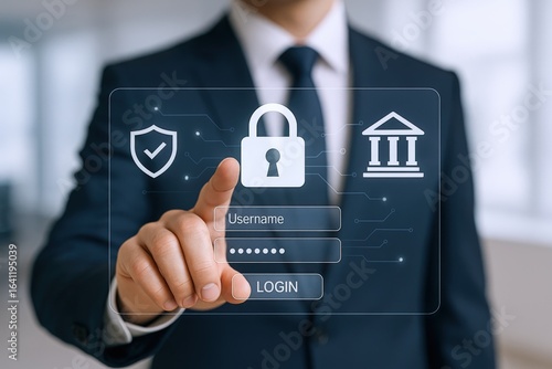 Secure Online Banking Concept: Businessman Touching Virtual Lock Symbol for Digital Security Interface