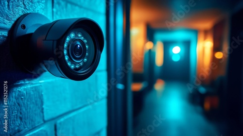 Security Camera Mounted On Brick Wall In Dark Corridor