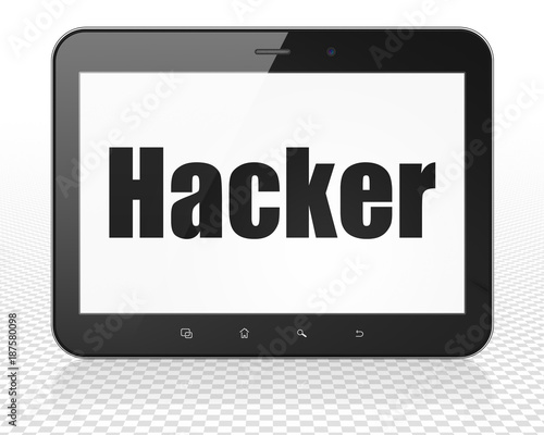 Security concept: Tablet Pc Computer with black text Hacker on display, 3D rendering