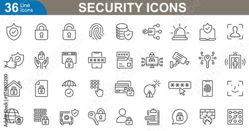 Security icons set. Lock, shield, firewall, key, encryption, fingerprint, password, virus, protection, secure and more. vector illustrator.
