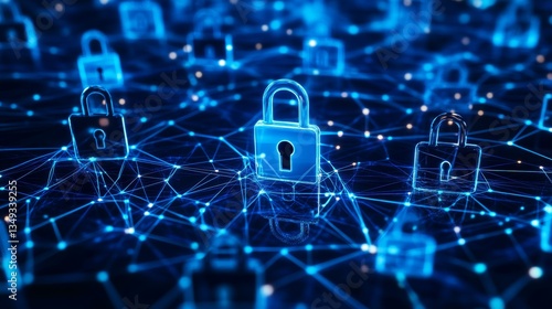 Security network with padlocks representing encryption and data protection Cyber security concept with abstract digital connection for secure communication and information transfer