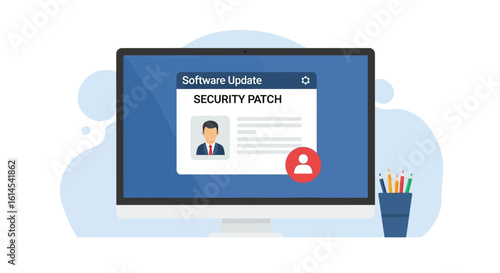 Security patch software update concept. Modern computer displaying update notification with user profile and secure icon. Vector illustration.