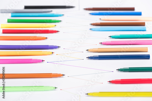 selective focus of colorful felt-tip pens on white background with connected drawn lines, connection and communication concept