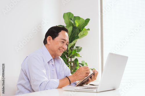 Senior man working with laptop and basic things for work at his desk