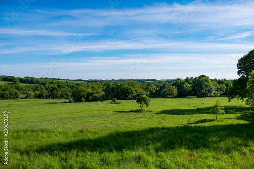 Senlac Hill has a historical background filled with war and change. Now lies just a lush green grass field filled with trees and sheep on a partially sunny day in England, UK.