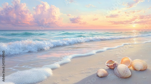 Serene Beach Scene at Sunset with Shells on the Golden Sand and Gentle Waves Lapping at the Shoreline