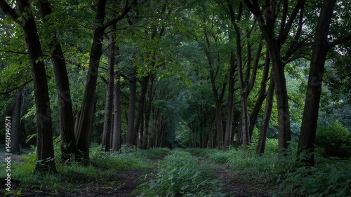 Serene Forest Path Illuminated by Soft Light, Leading into the D