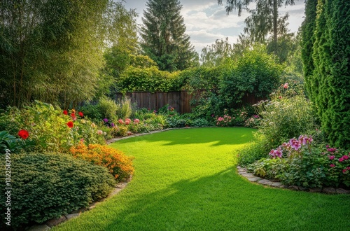 Serene Garden Landscape with Vibrant Flowers and Lush Green Lawn Surrounded by Trees and Shrubs Under a Clear Blue Sky in Late Afternoon Light