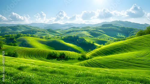 Serene green rolling hills under a bright blue sky with fluffy clouds, capturing the beauty of nature and tranquil landscapes.
