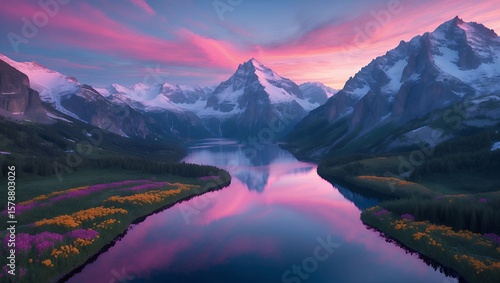Serene Lake Reflecting Snowy Mountains and Vibrant Sunset Sky