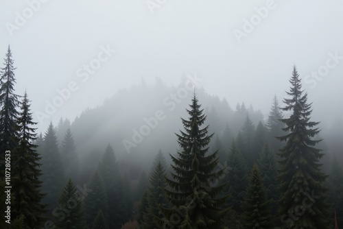 Serene misty fog enveloping majestic mountain pines in tranquil forest scenery.