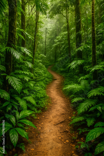 Serene pathway through lush green forest with foliage