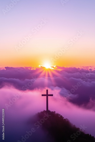 Serene Sunset Behind Cross on Mountain with Vibrant Sky
