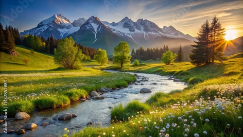 Serene Sunset Landscape A Tranquil River Meanders Through a Verdant Meadow, Framed by Majestic Snow-Capped Mountains and Lush Green Forest at Golden Hour