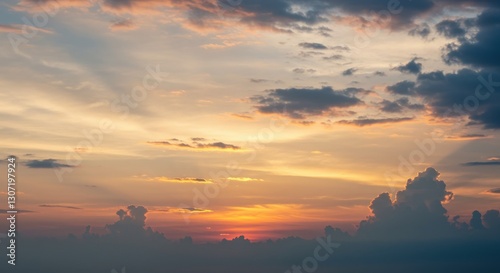 Serene sunset over a tranquil horizon with clouds reflecting warm colors