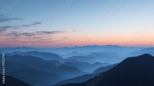 Serene Sunset Over Blue Mountains And Crescent Moon