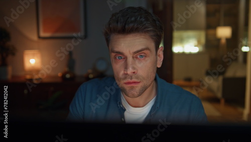 Serious man staring pc working late in home closeup. Guy reading presentation